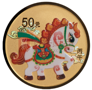 在构图上,该币以中心聚焦+背景烘托的方式,把吉祥喜庆的氛围拉满:小白马居于币面正中间,占据视觉核心,圆润的身形填满了画面,一种温柔感油然而生;上方的“50元”面额旁,缠绕着彩色祥云,下方的“丙午”字样也裹着云纹,让整个币面被祥云包裹。金色柔光的底衬像铺了一层碎金,彩色祥云则如霞光流转,既托住了小白马的萌态,又让“吉祥”的寓意从马身蔓延到整个画面,仿佛连空气里都飘着喜庆的气息。这种构图没有多余的元素堆砌,却用“小马为核、祥云为韵”的节奏,让“马上如意”的祝福从中心向四周弥漫,既符合贵金属纪念币的精致感,又把民俗祈愿的温度揉进了方寸之间。