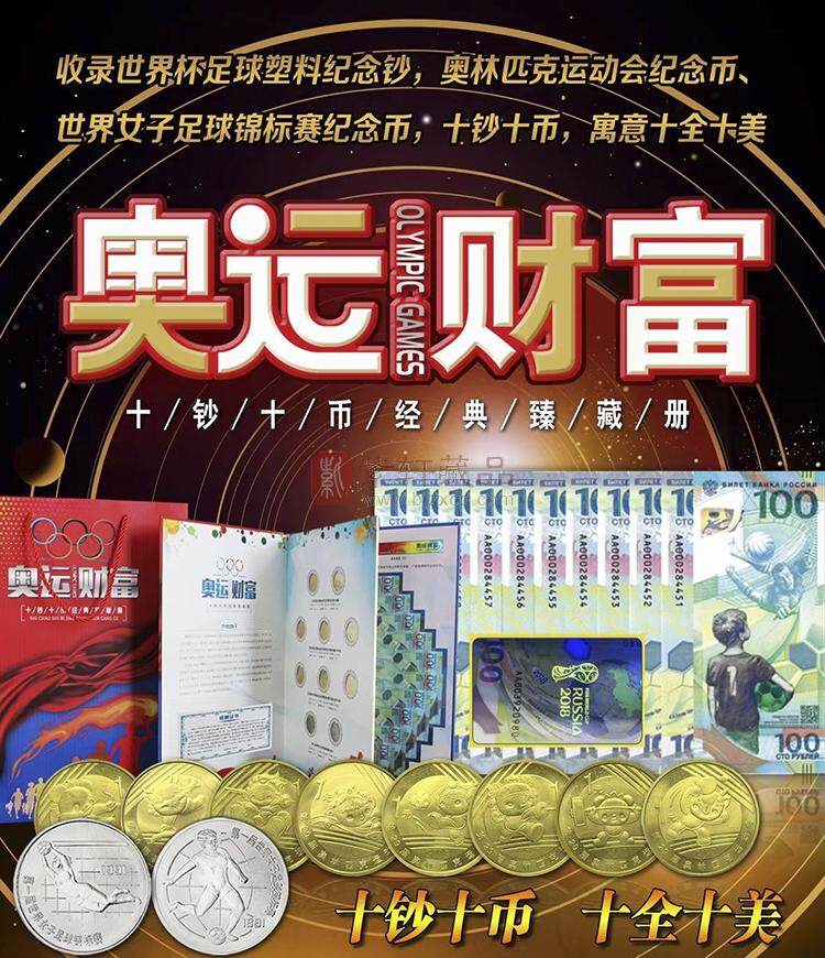 《奥运财富十钞十币经典臻藏册》全国限量发行2021套,真实钞币等面额兑换1010元,收录世界杯足球塑料纪念钞、奥林匹克运动会纪念币,世界女子足球锦标赛纪念币,十钞十币,寓意十全十美。
